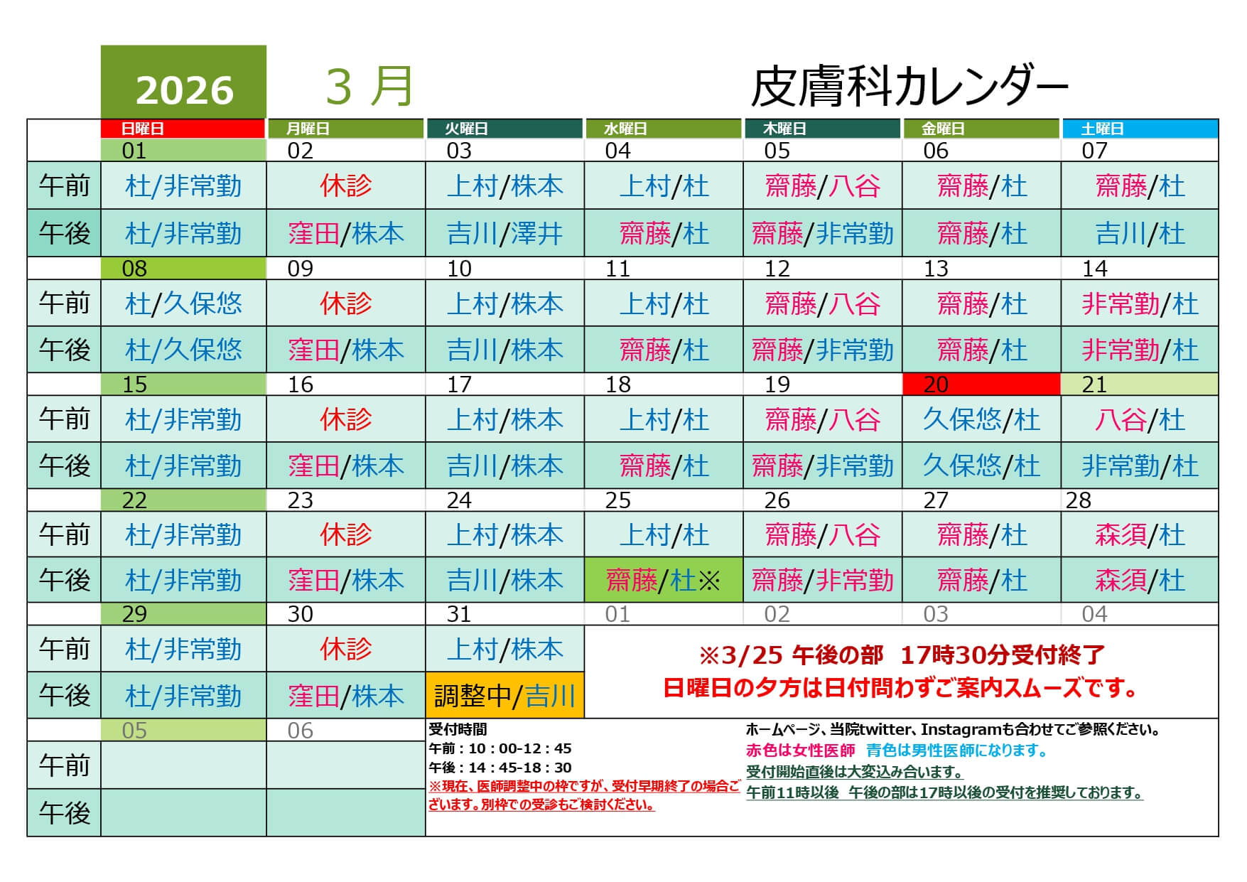 | 皮膚科 | 月 | 火 | 水 | 木 | 金 | 土 | 日 |