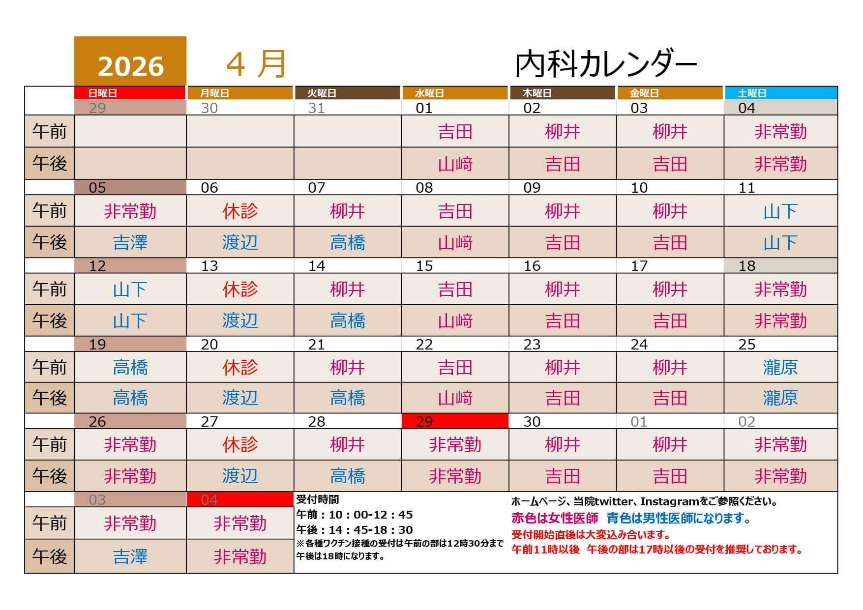 | 内科 | 月 | 火 | 水 | 木 | 金 | 土 | 日 |